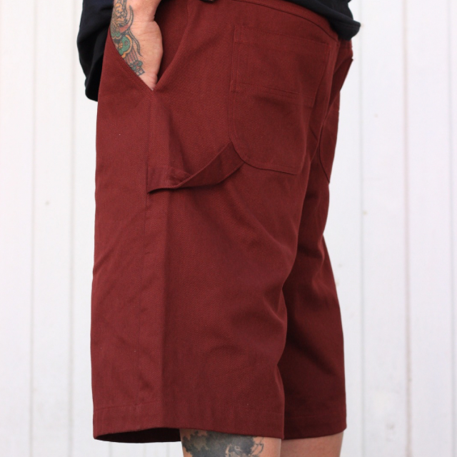 Bermuda carpenter, em tecido de sarja bordô, 100% algodão, com dois bolsos frontais e dois traseiros, fecho em botão personalizado e zíper YKK.