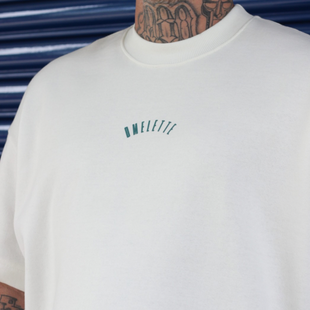 Camiseta oversized off white, em tecido moletinho, gramatura 400g/m², 50% algodão e 50% poliéster, gola canelada de 3,5 cm e barra com bainha de 3 cm.