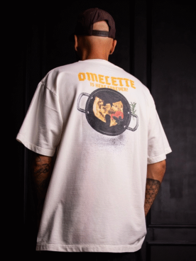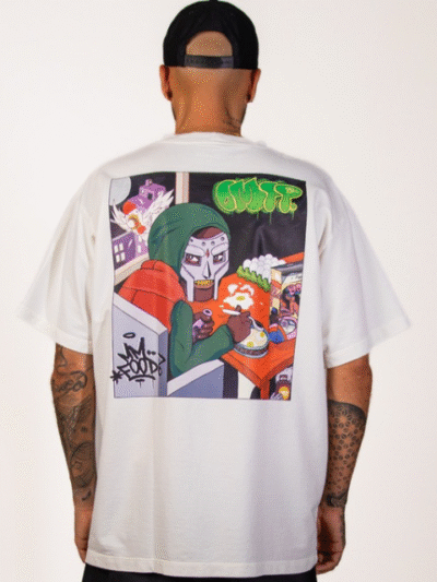 Camiseta oversized em tecido moletinho, 100% algodão, off white com gola regular canelada e estampa em DTF.